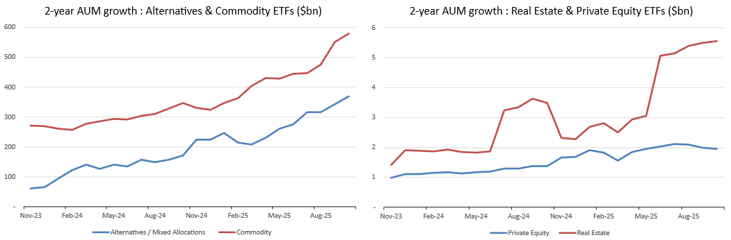 Beyond their growth over traditional underlying asset classes, ETFs are increasingly allowing for active exposure to flexible, sectoral, regional, thematic strategies, or even to less liquid assets.