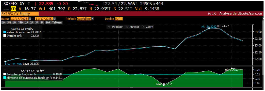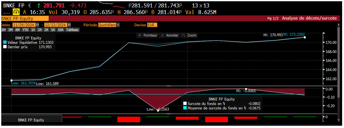 In this specific case of a banking ETF, we observe a “premium” in the market of 15 bps over its indicative NAV (or fair value) over a one-month period.